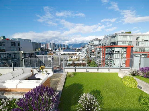 Penthouse living at Pinnacle False Creek with an oversized private rooftop patio! Welcome home to your bright, air conditioned 2 bed/2 bath + office/storage, open concept oasis. High 10.5 ft ceilings, this bright airy space allows light to pour through and a cross breeze w/ windows/doors on both sides. Gorgeous views of the city and mountains with access up to your very rare private rooftop patio! Loads of usable space for entertaining, veggie gardens... the possibilities are endless. Separated bedrooms for privacy. Located steps to the seawall, and all Olympic Village shops/restaurants, this location is unbeatable. Concierge for your convenience. Amenities include a gym, multi purpose room, kids playground. 1 parking & 1 storage. Yes to Pets!